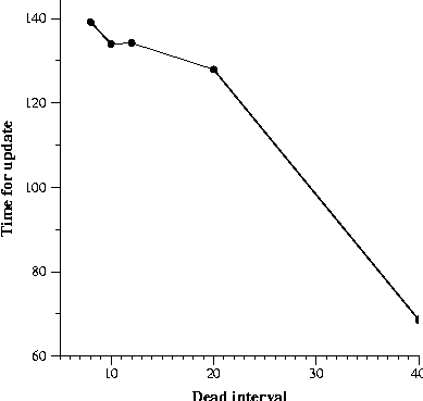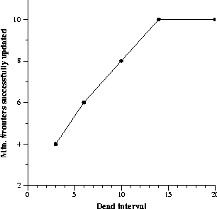 Interestingly, the timing values for trace-seq and trace-parallel were rather predictable and independent of the hello/dead interval values (and hence, the time taken for route changes). However, the same was not the case for reachable. The time for reachable depends on the order in which the routers are updated, and how soon the routes change. In our implementation of reachable, the order in which the routers were tried for update depended on the hash function used by Java (since the router names were initially put into a hash table). Figure 6 shows how the time for configuration for ignored: reachable changed with the dead interval in the network. The increase in time when the routes change more rapidly (i.e., at lower values of dead interval) comes from the increase in the number of indirect telnets performed and the timeouts when performing pings (when the routing is settling down). As mentioned in Appendix 1 and the implementation section, in our experiments, when there was a failure, retrying after a timeout of five seconds provided a router as per the condition in Proposition 1 in Appendix 1.