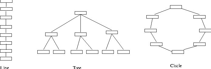 Experiments were conducted on networks of various topologies. Measurements on the three basic topologies (line, tree, and circle) shown in Figure 4 are reported below. The other topologies we experimented with were made up of these basic topologies, as are most networks. The main results from other topologies we tested were in agreement with what we present here.