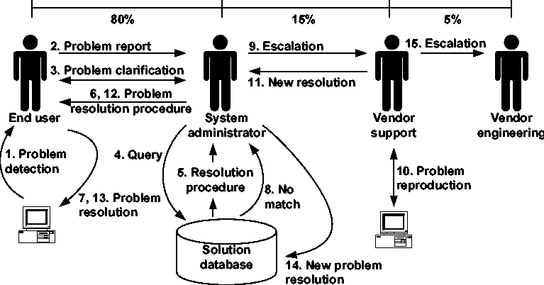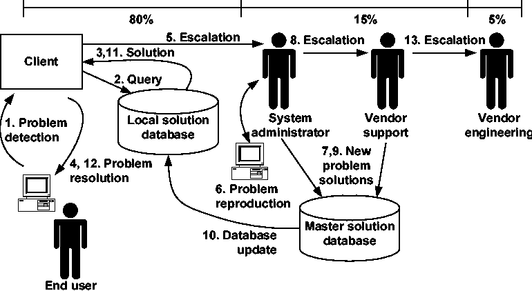 Figure 1 shows the traditional process for handling end user problems, as exemplified in [RSA00] and [Smi97]. The process starts when an end user determines that a problem is happening. The user contacts [Note 1] the system administrator. Through a discussion with the user, the administrator clarifies the nature of the problem, then searches through a database of pre-defined problem descriptions for a match. In many cases, the ``database'' is simply a mental list of common problems and solutions. It can also be an informal written list, or if the system administrator is using help desk software to manage the process, it may be an actual database. If a match is found, the administrator communicates the resolution to the user, and assists the user in applying it. [Etc98] describes that this process works well, solving as many as 80% of the problems encountered by end users [Sla00, Gil00, Sup00, Sch00, Hon00, CWS99, Loc00]. For the remaining 20% or so, the system administrator must become directly involved in the diagnosis and solution of the problem, and may need to escalate the process to include the software vendor. If the problem is escalated, the vendor uses product-specific knowledge to reproduce the problem and attempt to resolve it. If the resolution is successful, the procedure for resolving the problem is communicated back to the system administrator, who in turn communicates the resolution to the end user and assists in its application. In addition, the system administrator now adds this new problem and resolution to whatever ``database'' is used for solving common problems. In that way, new instances of the problem can be resolved more quickly, without needing either direct involvement or the assistance of the vendor. The 5% or so of problems that cannot be resolved by the vendor's customer support are escalated internally to the engineering team at the vendor, where development resources are brought to bear on diagnosing and resolving the problem. In this way, the efforts of the system administrator and the vendor's customer support group play two critical roles in the process: keeping the ``database'' populated with relevant problems and solutions for common recurring problems, and providing qualified, valid bug reports to the vendor's engineering staff.