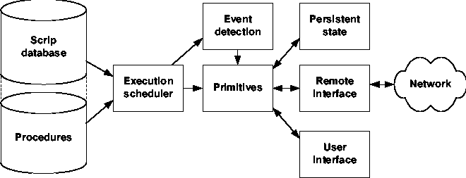 The execution scheduler is responsible for dynamically loading and executing the code for a scrip on an as-needed basis. It is in charge of managing the synchronization of scrips that are running in multiple threads, as well as passing information from detected events to the scrips. The database also contains procedures that are dynamically loaded when they are called from a scrip; the execution scheduler manages the loading and execution of these procedures, as well as the passing of parameters into and out of the procedures.