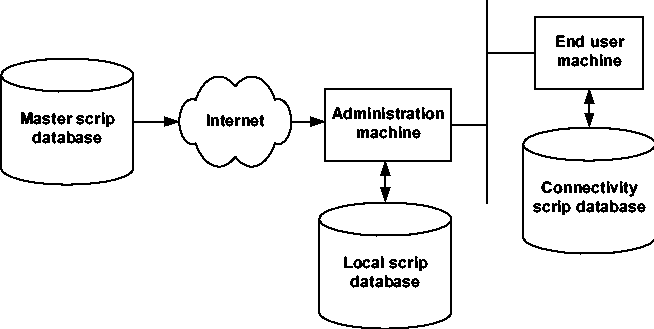 Much of the value of the system comes from the fact that the scrip database is updated on a regular basis, since end user issues change regularly as new products are introduced and new problems are discovered. As a matter of fact, one of the greatest benefits of implementing the client using a database architecture is the flexibility in providing this update. For example, the scrip database can be implemented as a central database, or a central database with local caching, or a distributed database, or a redundant database, or any combination of those options. In this application, a problem that affects network connectivity may isolate the client from the network, so a standalone local database is desirable. A simplified representation of the default product configuration is shown in Figure 4. A centralized master scrip database contains all available scrips. At the system administrator's facility, a local scrip database stores the subset of the master scrip database that is relevant to the local hardware and software configuration. At a regular interval (about once a week), the client on one of the administration machines initiates an incremental update of the local database to retrieve any new or modified scrips. All the machines at the facility access the local scrip database for the latest versions of all scrips. In addition, they also have a small database of scrips to solve connectivity that is replicated on every machine. If a machine cannot access the local scrip database due to a connectivity issue, this database helps to solve that problem first. Note that both the master scrip database and local scrip database can be replicated for improvements in reliability and performance.
