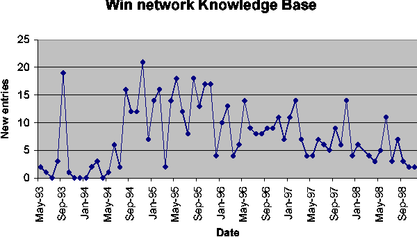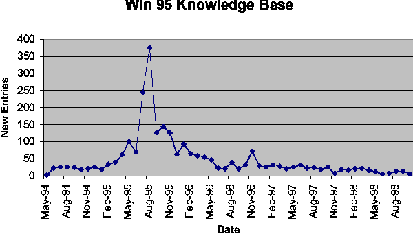 After the database is built, it needs to be maintained on an ongoing basis. Figure 5 shows the number of new entries as a function of time for the category ``Windows 95'' in [Mic00]. Except for an 8-month window around the operating system release, it shows about 25 new entries every month. Note that this is a pessimistic estimate, since not every entry in [Mic00] represents a problem, and even the ``problem'' entries do not all represent solutions that require automation. By way of comparison, Figure 6 shows the number of new entries as a function of time for the category ``Windows networks'' in [Mic00]. This graph has no particular peak around a product release, but shows about 10 new entries every month.