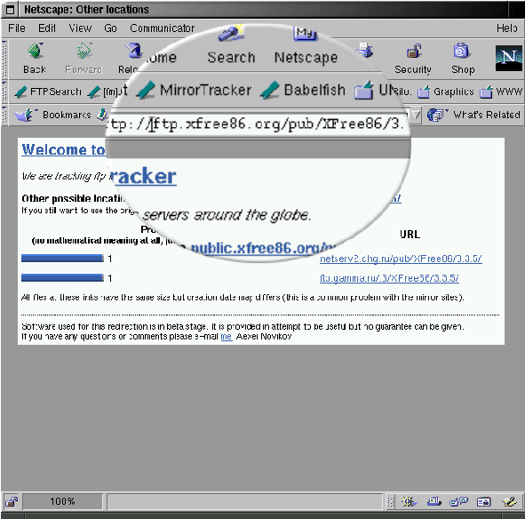 Pressing this button will cause the current URL to be sent for resolution by the FTP Mirror Tracker, and the results of the Mirror Tracker search to be presented in the browser's main window - as shown in Figure 1.