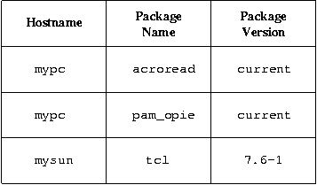 To illustrate, refer to the sample entries in Figure 2. From here we can see that the machine called ``mypc'' (which is running Linux) should have the current version of acroread installed. As we saw before in Figure 1, the current available version of acroread for Linux is 4.05-1, so that means mypc will have acroread version 4.05-1 installed. Similarly, we can see that this machine will have pam_opie version 0.21-3 installed. Finally, we can see that machine ``mysun'' (which is running Solaris) will have tcl version 7.6-1 installed, even though the current version of tcl in the software table is 8.1.1-1.
