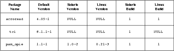 For example, looking at the entries given in Figure 1, we can see that an acroread RPM is available for both Solaris and Linux, and that the default version of the acroread package is 4.05-1 for all OSes. On the other hand, a tcl RPM is isn't available for Linux (it wasn't necessary to make one, since Linux already includes tcl) but is for Solaris. Finally, we see that the default version of the pam_opie package is 1.1-1, but that Solaris systems should use version 1.0-2 while Linux systems should use version 0.21-3.