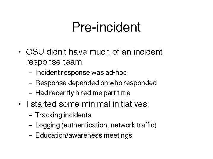 Awareness meetings really facilitated formation of a formal incident response team, by the way – generated lots of good will, spirit of cooperation, etc.