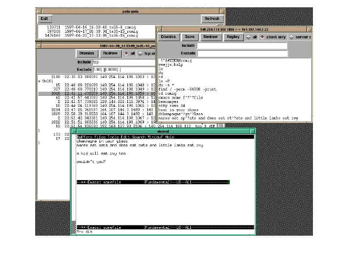 This is a set of the typical windows that you might see when using review – top left is the “log listing” window, middle left is the “session summary” window that shows what sessions are within a selected log file, upper right is a “session content” windo