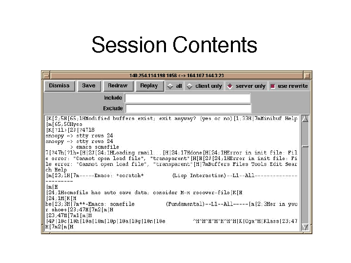 This shows the printable characters from the server->client traffic for a telnet session. In this case, the target was using “emacs”, which uses terminal escape-sequences to manipulate the appearance of the screen/terminal emulator. This makes it ha