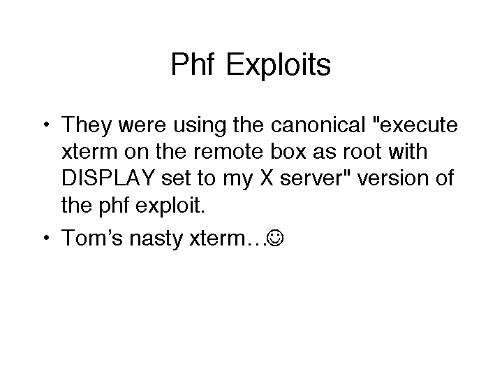 Tom’s look-alike takes advantage of the open permissions at the X server end of the exploit. When run, it grabs a screen shot, keystrokes and some other things.