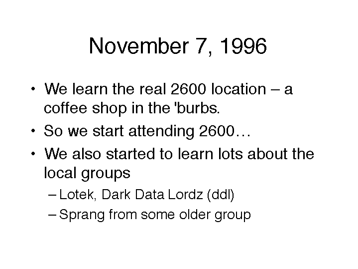 sometime around here we started visiting the 2600 meetings. i think we went 3-4 times. first meeting was fairly funny - mark and i went, mark spotted them as they slowly arrived. they pulled several tables together right next to us, and we could easily