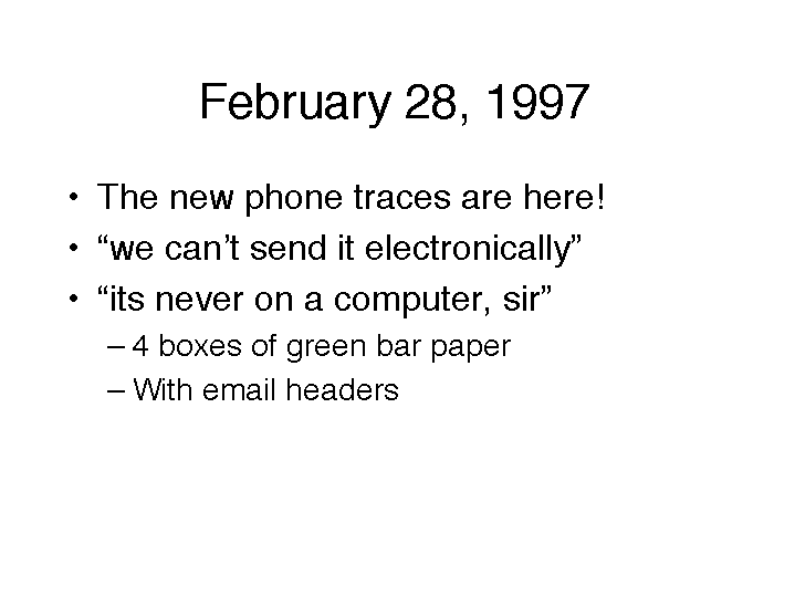 We apparently got the phone trace results (big boxes of green bar paper, ick). i searched by hand (by call duration and ending time, not starting time due to event lag), identified the calling phone numbers for 3 of the intruders. info matched what we k