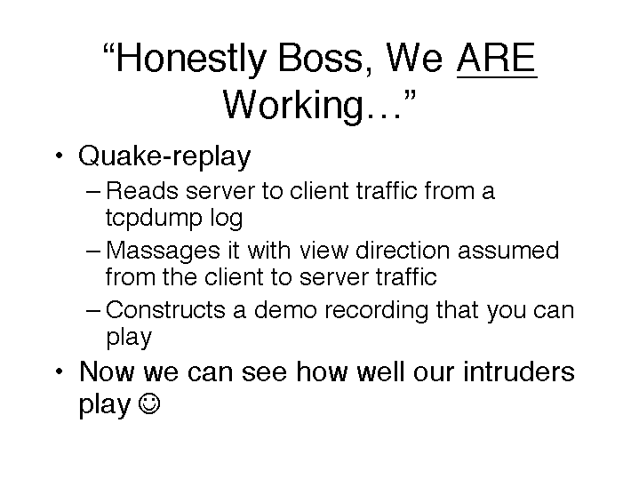There are limitations to the fidelity of the playback – we can’t know what direction the client was actually looking. Usually, that would be the direction of motion or firing (which is what we use), but they might be side stepping.