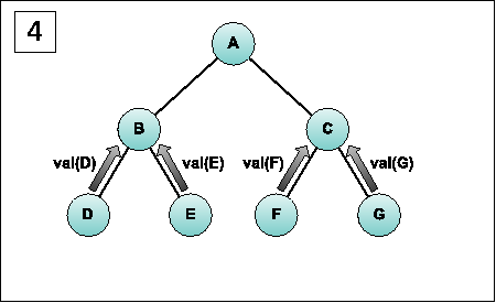 The simplest example of a network pattern is the echo pattern [7, 8]. During its execution, echo creates a spanning tree topology, with root of the tree chosen a by an administrator. The pattern has two phases of communication: expansion and contraction (see Figure 3). During the expansion phase, the root node issues a query to its children. Each node in the tree repeats this process. The contraction begins as the query reaches a leaf node. The leaf node answers the query, sending its response to its parent in the tree. The parent receives the response of its children, aggregates or calculates information for the query to the fullest extent possible, and then sends a single aggregate answer to its own parent. This process is repeated recursively, until the root node is reached, which aggregates the messages from its children. The tree topology provides for parallelized execution, while the aggregation of query responses during contraction reduces the amount of traffic that would otherwise be necessary. The echo pattern therefore forms a wave, spreading out from the root to the edge of the network and back, collecting data as it progresses. Echo is intrinsically a "push" protocol, and is easily understood as a recursive descent parser.
