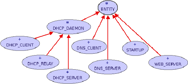 Figure 1 shows a simplified graphical representation of the domain model in the BON notation [40]. All classes, such as DHCP server and web server, have one common ancestor: ENTITY. The ENTITY class is used for modeling common functionalities. The arrows denote inheritance relationships. The simplified example presented in Figure 1 uses only single inheritance relationships. In real life examples, multiple inheritance is often necessary. Eiffel supports this.