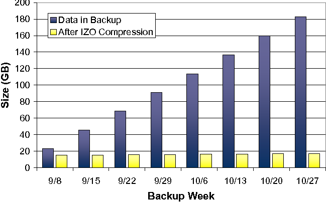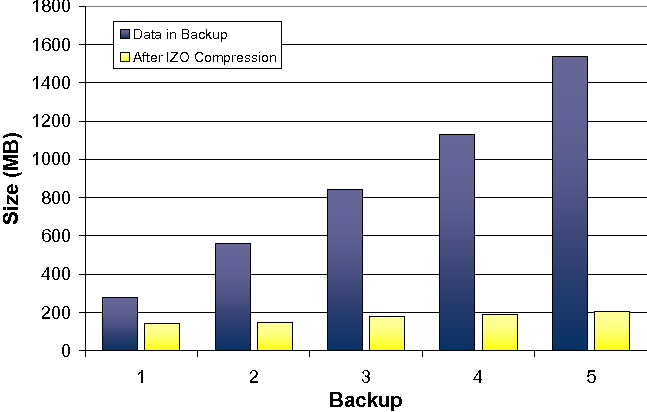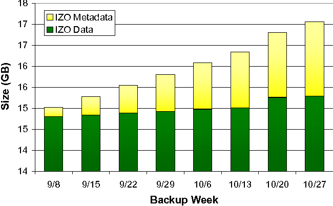 It is interesting to note where the growth in the IZO archive actually occurs (see Figure 11). The IZO archive grows from 15 GB to store a single image to 17 GB to store all 8 images. However, the growth of the actual data stored in the archive grows even more slowly. The predominant growth of the data can be attributed to the reconstruction metadata used to point back to the data in previous backups. We are currently investigating ways to compress the metadata itself, by looking at similarities in the metadata between different backups.
