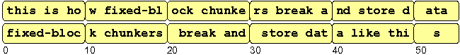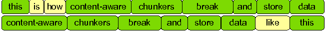 Content-Aware Chunking: This method, illustrated in Figure 2, generates chunks by parsing the input files and understanding their formats. Chunk boundaries can be custom generated for the highest probability of redundancy. In this example, boundaries are created between words. This method does not suffer from byte-shifting issues, and can produce larger chunks, but is useful only for known data types and can be very expensive because the data must be interpreted.