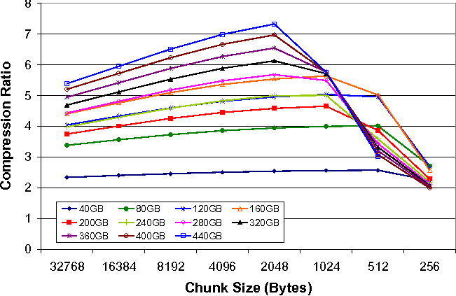 Figure 7 shows the overall fold+compress ratios for these image sets at each block size. The best overall compression is garnered from 2 KB block sizes. In our experience with this tool, generally we find that with large datasets, in the hundreds of GBs for example, block sizes in the range of 2 KB to 8 KB yield a good folding factor. When dataset size is smaller than 10 GB or so, the block size can be reduced, with 128 bytes as the lower limit.