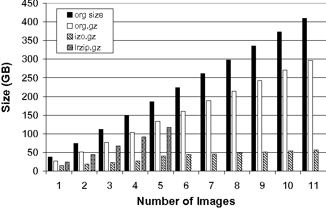 Figure 8 illustrates these finding across all of the machine images. While the original size (in black) and gzip size (in white) continue to increase rapidly with the number of images, IZO+gzip (in stripes) grows much more slowly. lrzip+gzip does slightly better than gzip alone, but does not approach the IZO+gzip ratios.