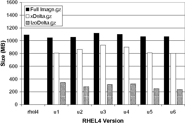 We find, however, that the differences between these base images can be quite small. Using the original image as a ``template,'' the updates then become ``deltas.'' We use RedHat Enterprise Linux 4 WS as our test image for this scenario. As a framework, we used Xen on a Fedora Core 7 machine, but since we were using hardware virtualization from the processor and raw files for disk images the same results can be achieved using other VM solutions. We installed each operating system on a 10 GB partition answering ``yes'' to all questions, starting with the base RHEL4 and then doing the same for the updates u1 through u6. We then create the binary delta between the initial RHEL4 image and the RHEL4U1 image; the RHEL4U1 image and the RHEL4U2 image; and so on.