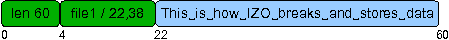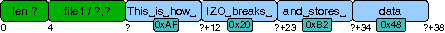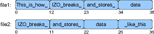 The design of the IZO data format was driven by the desire to pack data and metadata as tightly as possible into the resulting archive. Instead of storing a list of chunk identifiers for each file, we use offsets and lengths within the archive. In particular, if a sequence of chunks from the original file is new to the system, then it is being stored as the same sequence into the output file, requiring only one {offset, length} tuple. Because we keep track of all individual segments during compression, it is still possible to match sub-sequences within this data.