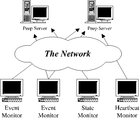 Alternatively, system administrators may decide to dedicate a machine to run Peep software and want all clients to execute on a single machine. In this situation, broadcasting becomes totally unnecessary and inefficient. Instead, the user can disable the auto-discovery mechanism. Clients will then become dumb clients, continually processing and sending event information to a server throughout the course of their lifetimes. Peep also provides the user the choice of mixing and matching, applying distributed and centralized configurations where they make sense.