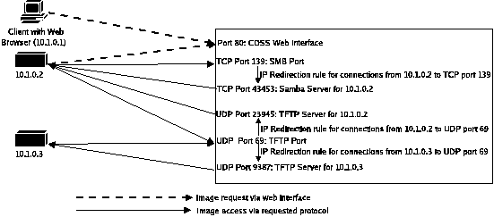 Once the system has prepared the images and started the necessary servers, the firewall must be configured to allow connections from the requesting user. Connections to the standard ports for each protocol must also be correctly redirected to the unique port allocated to the user for that protocol. Finally, the firewall rules must prevent non- authorized users from connecting directly to the server instances, bypassing the redirect in place on the standard port for each protocol. CDSS currently supports the Linux IPTables and IPChains firewalling systems, although it could be extended to support any firewalling system that can accept rule changes in real-time and transparently redirect connections to alternate ports on the same machine.