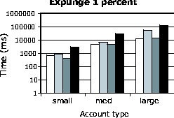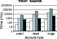 ![]() ![]() Beating UW and Courier by a much wider margin, mySQL clearly demonstrates the advantage of intelligent indexing. Although it takes initial overhead to precompute[Note 2], the full-text index allows mySQL to find text in message bodies much more quickly than all three other solutions. Overall, this suggests that a database solution will be most efficient when indexing is utilized or a user's mailbox constitutes a majority of the total mail stored on the server. The disadvantage of a database solution is that the combined size of all accounts affects its performance on each account, so the worst-case scenario is when a user's account is small but the server stores a large quantity of mail in other accounts. Searching Specific Header FieldsSee Figure 2 for the graphical results of searching the `From' and `Date' header fields. All standard deviations were less than 0.1, except as noted: § standard deviation = 3.6; ¤ standard deviation = 0.93. On a search over specific header fields, Cyrus and mySQL once again outperform both file-based servers on all three accounts, with the exception of UW's superior performance on the date search on the small account. Given that the database solutions still scale in a far superior manner, this exception seems negligible. An index on the header information makes this search an extremely simple database problem, though without the overhead of a traditional relational database, Cyrus can execute these queries more quickly than mySQL. UW, while still slower than Cyrus, outperforms Courier - UW merely performs the equivalent of a grep on a single file, while Courier must open and close every single message file. ExpungingFigure 3 shows the times for expunging 1 and 20 percent of the box's mail. Expunging messages flagged for deletion proved to be a particularly elucidating test. Cyrus dramatically beats UW when purging a relatively small number of messages but takes much longer than UW when the number of deleted messages grows to 20 percent. Opening the mbox file and rewriting it are the most costly disk operations UW must perform; identifying messages for deletion once the file is open should be relatively quick, and the more messages UW deletes, the less data it must write back to disk. In contrast, although Cyrus seems to have quicker access to the messages it must delete, it scales more slowly when it deletes a large number of messages. Cyrus must also update its indices as it deletes, and this can be a costly operation for a deletion as large as 20 percent. Data for mySQL further demonstrates the cost of maintaining extensive indices: although our SQL schema allows mySQL to perform queries quickly, its performance suffers severely when it must delete messages. Courier's deletion times scale approximately linearly with the number of messages. Courier's deletion process requires no significant overhead, it is simply a matter of deleting one file for each message.