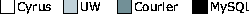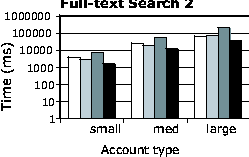Our setup attempts to model email usage and configuration of users from three different categories. The small user represents a typical webmail user with a relatively small quota. The medium user represents the average size for a commercial or academic email account. The large mailbox typifies a high-volume account which regularly accumulates thousands of emails, such as a corporate account. Our basic configuration models the typical na"ive user who saves every message in the inbox. Our mySQL database schema consists of a table of messages for each account size, small, medium, and large. Each table stores header information and the message body in separate fields. We strategically defined indices on properties we expected to be particularly relevant to typical IMAP usage. For instance, we created a full-text index on subject, body, sender, and recipient. Thus the mySQL model and Cyrus used storage mechanisms designed to structure data intelligently, while UW and Courier used standard file system structures. Arguably, the playing field would have been more level with a standard IMAP server altered to use a mySQL database rather than a database model independent of the rest of the IMAP server. We chose the latter option for a number of reasons: we wanted to test publicly available software rather than customized versions; we believe overhead of accessing the data source will outweigh other factors necessary to run an IMAP server; and our time and resource constraints made it difficult to integrate mySQL storage into an existing IMAP server. To generate a large collection of diverse email, we created an email alias (namely emagnet@hein.eecs. harvard.edu) to the three accounts on each server and then subscribed emagnet to a large variety of mailing lists. Thus, each account received exactly the same email. This approach allowed us to measure each server's performance on real email, rather than artificially created messages. It also guaranteed diversity in the mail headers, so that we could accurately test the servers' searching abilities. The benchmark times the following requests: