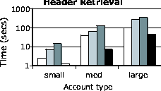 We measured times from the perspective of the mail client application. That is, the time necessary for the request is the difference between the time at which the client sends the request and the time at which it receives data back from the server. We ran each of our tests cold, i.e., the server had not previously accessed the data we queried. To avoid network-related timing delays, our benchmark client runs on the server. We ran each test (except expunging deleted messages) three times; results are the average of the three numbers. ResultsHeader Retrieval TimesFirst, the header retrieval times in tabular format: