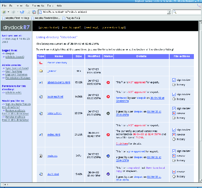 After looking over an unapproved file and finding it fit for public viewing, a content approver signs the file, instructing DryDock to mark the file as authorized for publication. For added security, DryDock can be configured to require additional information to complete the signing process, such as the name of the document author or a note explaining why the file is being signed. Once the file is signed, DryDock automatically copies it from the development tree to the export tree. Finally, DryDock synchronizes the staging server's export tree to the production server over SSH, replacing the external web site with an updated copy containing newly signed files. Since the staging server's export tree is separate from the development tree, deleting a file from one will not delete it from the other. To remove a file from the export tree, a content approver uses DryDock's web interface to mark that file as revoked. This removes the file from the set of files copied to the external web server during the next synchronization. While signing authority is given to a limited number of users, a larger number can be given review authority, or the ability to soft-sign files. Reviewing files follows the same process as signing files, save for two important differences: approval information is optional and can be incomplete, and reviewed files still require an authorized signature for publication. At ARL:UT, review is employed by users to partially fill in approval information for a file so that when a signer moves to authorize that file for publication, much of the data required is already present. Review provides much of the same functionality as signing a file, but without a signature's consequences. Though DryDock's approval process works well for most documents, rapidly changing documents must be continually re-signed by content approvers for each change to appear on the external web site. To ease dealing with these types of files, a user can sign them as pre- approved; files marked as such will be copied to the production server during synchronization even if their contents have changed since they were signed. Since file pre-approval circumvents DryDock's typical workflow process, we advise our users to apply the option sparingly; users must be vigilant about pre-approved files' content. Web Developer MigrationMigrating web developers to DryDock's web publishing process should be painless. Instead of placing content directly onto the production server, web developers now place documents onto the staging server. At ARL:UT, we configured our staging server to support the same access methods our web developers have always used: FTP, Samba, and NFS. Since nearly all off-the-shelf web development tools can use at least one these methods to edit pages, we simply instructed our web authors to re-configure their tools to point to the appropriate directory on the staging server. In most cases, web developers shouldn't have to change their pages for DryDock. In a proper DryDock setup, the staging server's web server environment mimics that of the production server, so properly functioning pages on the staging server will still work when exported to the production machine. The lone caveat is the avoidance of absolute links: since the production server (not the staging server) will be serving up content to the public, any links in a web page explicitly mentioning the staging server will not work. Relative links solve this problem by not mentioning the server name in the link address; the web server assumes the document is local. However, there is one situation in which use of a relative link is impossible. If page authors need to refer to a secure page from an insecure page, they need to refer to the host using https:// instead of https://. Since it isn't possible to specify a protocol in a relative link, an absolute link is required. The solution we employed at ARL:UT was to use a simple server-side-include variable that contains the host name of the machine from which the page is served. Page authors then construct an absolute link, using the variable in place of the host name, and the correct server name is inserted dynamically. Benefits to AdministratorsImproved Information SecurityDryDock safeguards against the dissemination of inappropriate web content by codifying a formal document approval process. It ensures that all updates to web content are inspected for propriety before they ever escape the shelter of the internal network. DryDock makes users accountable for the documents they approve; if content is found to be inappropriate, administrators can easily determine who let that content through. DryDock acts as a document firewall. Just as a traditional firewall regulates the flow of packets to a private network, DryDock regulates the flow of documents to the production web server; they are both access control mechanisms. Through signing, pre-approving, and revoking files, DryDock users create rule sets that manage the movement of documents into and out of its export tree. ![]() Content AuditingDryDock goes to great lengths to log all user and system activity and keep administrators abreast of all changes in web content. DryDock provides administrators with an auditing console that lets them browse DryDock's records. Administrators can inspect the most recent events, all events pertaining to a user, or any events within a specified date range, or they can perform a free-text search to tailor the results to their liking. For greater detail, administrators can peruse DryDock's extensive log files. To immediately notify administrators of changes in content, DryDock can be configured to send out email whenever activity occurs. With these tools, administrators can easily diagnose problems with content. If a document is approved that is later found to be unsuitable for the public, administrators can refer to the email DryDock sent when the file was signed; the email indicates the parties responsible for app