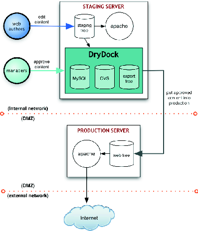 ![]() Sweeping, monolithic content management systems such as Vignette StoryServer [17] were inappropriate for our environment. ARL:UT is comprised of many autonomous groups that have their own web development methods and practices. While the need for a formal information security process was universally recognized, a sweeping content management system was both politically infeasible and far too expensive. Portal and weblog systems such as PostNuke [7], Tiki [20], or Plone [8] focus on creating highly dynamic, interactive web sites. Thus, they frequently offer collaborative features such as article syndication, Wiki[Note 1] systems, forums, and user commentary. At ARL:UT, however, we needed a strict web presence that was decidedly static and non-collaborative - this obviated many of these systems' features. All we wanted was software that would allow approved documents through to the web server, while blocking all other unauthorized updates. All of these packages required so much customization that it was easier for us to build our own solution, tailored specifically to our environment. Having resigned ourselves to writing a custom tool, we began looking at platforms upon which we could base our application. We were particularly interested in the Zope [16] application server. Written in Python, Zope has been used to build many complex and dynamic web sites. Its features include user management, web-based administration, searching, clustering, and syndication. Like the aforementioned packages, however, a great deal of Zope's dynamic componentry was of no use to us, and much of Zope's functionality fell far outside the scope of simple publication oversight. Though these issues weren't intractable, when combined with Zope's steep learning curve, they led us to look at other less complex and less ambitious platforms. We settled on WebKit, the Webware for Python [22] application server. WebKit uses a design pattern fashioned after Sun's Java Servlet [15] architecture (a paradigm we were familiar with), and includes little extraneous, dynamic componentry we'd have to work around. We could implement all of the heavy-lifting functionality in plain Python and use a small number of servlets to expose a web interface - we found such an architecture much more workable via WebKit than Zope. ![]() Using WebKit, we devised an application that would give us the security and auditing features we required. Several months later, we put DryDock into production. DryDock has been managing our web publishing for over a year and a half now. What Is DryDock?DryDock tackles our information security problem in two main ways: by implementing a dual web server setup, and by forcing a separation between creating content and approving its publication. Figure 1 details the process of web publishing using DryDock. DryDock's dual web server setup is comprised of a production machine and a staging machine, both of which have identical web server configurations. The production server holds content suitable for the public and resides in a publicly accessible DMZ[Note 2] [14], while the staging server resides behind the firewall as part of the internal network. The staging server houses a web tree containing files under development (the development tree) and a separate tree containing files authorized for publication (the export tree). The development tree is accessible to web authors on the internal network, while the export tree is solely managed by DryDock. Managers (content approvers) use DryDock's web interface (Figure 2) to browse the staging server. The web interface presents an integrated and easily discernible view of the development tree and the export tree which shows them: