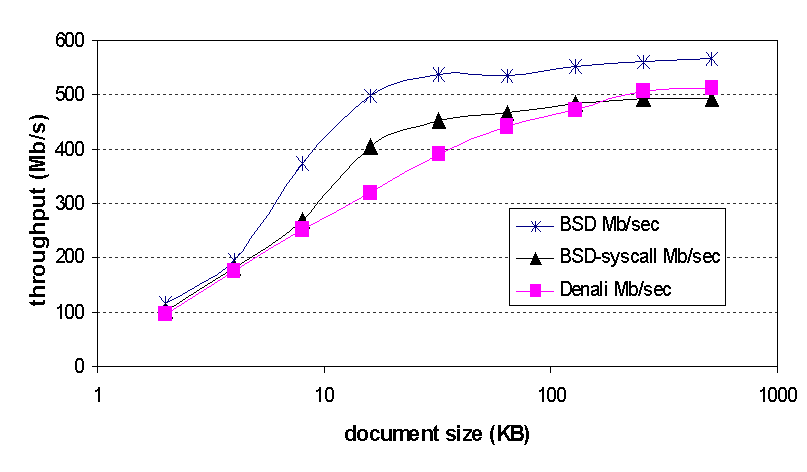 For small documents, there are about as many system calls per connection in BSD (accept, reads, writes, and close) as there are user/kernel packet crossings in Denali. For large documents, the system bottleneck becomes the Intel PRO/1000 Ethernet card. Therefore, it is only for medium-sized documents that the packet delivery to the user-level networking stack in Denali induces a noticeable penalty; we confirmed this effect by adding a system call per packet to the BSD web server, observing that with this additional overhead, the BSD performance closely matched that of Denali even for medium-sized documents (Figure 3).