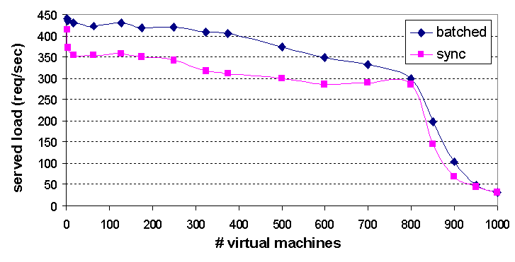 Denali utilizes a batched, asynchronous model for virtual interrupt delivery. In Figure 4, we quantify the performance gain of Denali's batched, asynchronous interrupt model, relative to the performance of synchronous interrupts. To gather the synchronous interrupt data, we modified Denali's scheduler to immediately context switch into a VM when an interrupt arrives for it. We then measured the aggregate performance of our web server application serving a 100KB document, as a function of the number of simultaneously running VMs. For a small number of VMs, there was no apparent benefit, but up to a 30% gain was achieved with batched interrupts for up to 800 VMs. Most of this gain is attributable to a reduction in context switching frequency (and therefore overhead). For a very large number of VMs (over 800), performance was dominated by the costs of the isolation kernel paging VMs in and out of core.