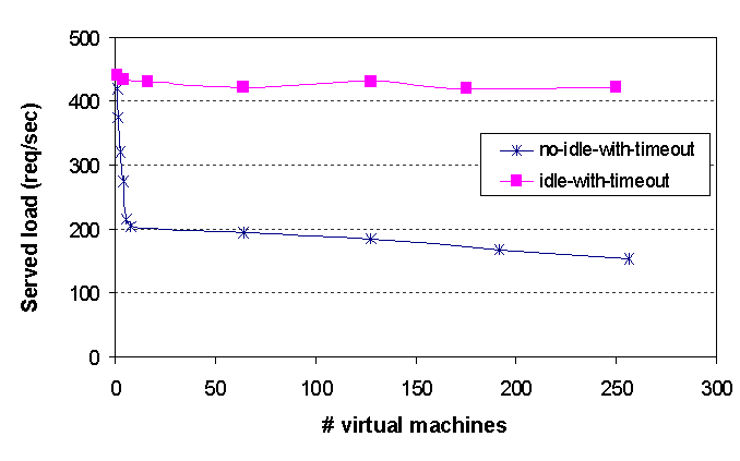 To measure the benefit of the idle-with-timeout virtual instruction, we compared the performance of web server VMs serving 100KB documents across in two scenarios. In the first scenario, the VMs exploited the timeout feature: a guest OS with no schedulable threads invokes the idle-with-timeout instruction with a timeout value set to the smallest pending TCP retransmission timer. In the second scenario, VMs did not use the timeout feature, idling only when there were no schedulable threads and no pending TCP retransmission timers.