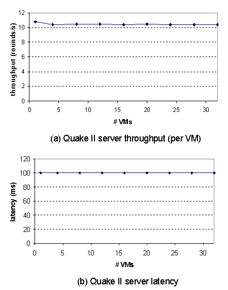 As we scaled up the number of VMs (and the number of clients generating load), the average throughput and latency of each server VM remained essentially constant. At 32 VMs, we ran out of client machines to generate load. Even with this degree of multiplexing, both throughput and latency remained constant, suggesting that the clients' game experiences would still be good.