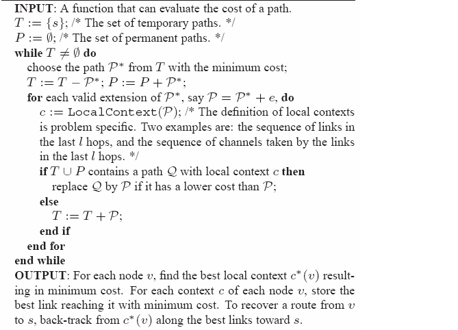 The previous section showed two concrete examples of how context helps in making routing metrics more powerful. After defining a good context-based path metric, the subsequent challenge is to find the optimal (or near-optimal) route under the path metric. A context-based routing protocol needs both a context-based metric and a way to find good paths under such metrics. In this section, we develop such a path finding method called CPP (Context-based Path Pruning) that can find paths under any generic context-based metric. As a starting point, we first consider a link state routing framework. In link state routing, each router measures the cost to each of its neighbors, constructs a packet including these measurements, sends it to all other routers, and computes the shortest paths locally. Hence for link state routing, what is needed is a centralized algorithm for computing the shortest paths. The CPP method will be explained as a centralized algorithm. But we note that it can also be applied in some distributed settings, such as distance vector protocols and on-demand route discovery; these extensions are omitted in the interest of space.
