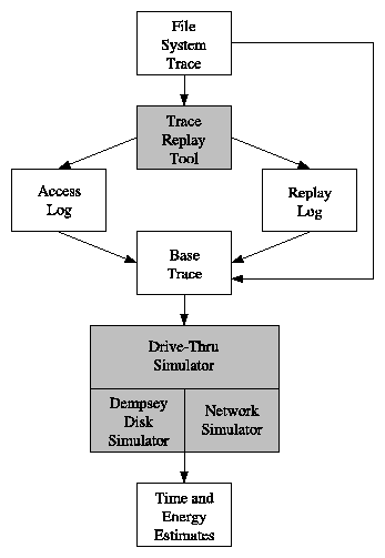 As described in Section 2.4, the Drive-Thru simulator delays, eliminates, and coalesces I/O accesses depending upon the specific power-management algorithms specified at each layer of the storage hierarchy. Each resulting I/O access is then passed to a device-specific simulator that models network or storage. For disk simulation, we use Dempsey [30], a modified version of DiskSim [5] that simulates both time and energy. For network simulation, we use a custom 802.11b simulation module. As output, Drive-Thru gives the expected time and energy to replay the trace on the target platform. By changing the parameters of the Drive-Thru simulator, one can quickly investigate alternative file system, cache, and device power management strategies.