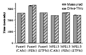 In Figures 4(e h), we show the accuracy of Drive-Thru's estimates for the Purcell and NFS15 traces. For each trace, we examine behavior using 802.11b's CAM and PSM modes [11], as well as the adaptive STPM policy [1]. On average, Drive-Thru's estimates are within 0.86% of measured values for total time and within 0.90% for total energy. When we remove idle time from consideration, Drive-Thru's estimates are, on average, within 13% for file system time and within 7% for file system energy usage.