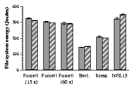 We ran the 45-minute Purcell trace used in Section 3 on BlueFS with and without our modification. Our experimental setup was the same as before, except that we allowed BlueFS to use both the network server and a local cache on the microdrive s ext2 file system. As shown in Figure 8, using flush on spin-down for the local cache reduces file system energy usage by 12.4%. Note that this improvement is for a file system that has already been substantially optimized to reduce energy usage. Given that this change also reduces trace execution time, it seems a nice improvement. Although total energy savings for the entire system is only 1.4%, our experiment assumes that the handheld does not hibernate or employ similar system-wide power-saving modes during periods of inactivity. We make this conservative assumption because our file system traces do not record sufficient information to predict when the system would hibernate.