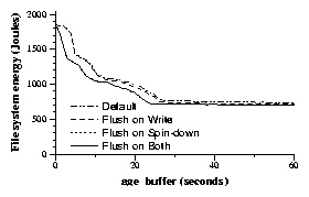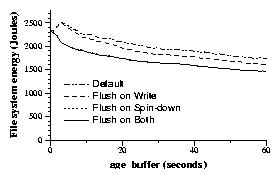 We were surprised to see that increasing age_buffer beyond the Linux default of 30 seconds has little effect on energy consumption. On average, increasing age_buffer from 30 to 60 seconds reduces file system energy usage by only 8% (assuming flush on spin-down is implemented). Increasing the value to more than 60 seconds does not significantly decrease energy usage further. Intuitively, the effect is minimal because the distribution of disk accesses is such that few interarrival times fall between 30 and 60 seconds. Unlike the other two policies, increasing age_buffer has a substantial downside because it increases the window during which data may be lost due to system crash. Therefore, we recommend that age_buffer be left unchanged unless storage energy usage is an overriding concern.