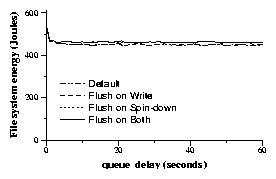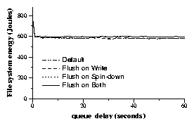Comparing Figures 5 and 7, it is immediately apparent that the three policies under study have a markedly different effect on the network file system than they do on the local disk file system. The flush on PSM policy appears to have a slight negative effect, increasing file system energy usage for all values of queue_delay greater than a few seconds. The flush on write policy has no noticeable impact, using essentially the same energy as the default policy. We have also observed that neither policy has a significant effect on trace replay time.