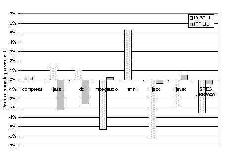 LIL code implants, their implementation, and their performance benefits are described in more detail by Cierniak et al. [6]. 5 LIL PerformanceIn designing LIL, our goal was to obtain the benefits described in the previous section without sacrificing ORP's excellent performance. Since ORP previously implemented all its stubs through hand-crafted machine-code generation, it is possible to compare the performance of LIL stubs to that of hand-coded stubs. This section will present this comparison and show that we have mostly retained performance. Figure 4 lists the LIL stubs that have been written so far, and the stubs for which LIL versions have not yet been written. Of the non-LIL stubs, the CLI stubs and atomic compare-and-swap stubs should be straightforward—we have not gotten around to them yet. The other two stubs require additional features for LIL that are highly specific to those two stubs. Having the hand-coded assembly versions of these stubs is roughly equivalent to the additions that would be needed to the LIL code generator to support them. We evaluate the overhead of LIL by measuring ORP with hand-coded assembly versions of all stubs versus ORP with LIL versions of the stubs where they exist, on both the IA-32 and IPF architectures. We make a few exceptions for several performance-critical stubs, whose assembly versions have been highly tuned for their particular platforms. These are the object monitor enter and exit stubs on the IA-32 architecture, and the new object, new array, and character-array copy stubs on the IPF architecture. The IA-32 performance numbers were obtained on a 4-processor, 2.0 GHz Intel® XeonTM processor-based machine with HyperThreading disabled, with 4 GB physical memory, and running Windows 2000 Advanced Server. The IPF performance numbers were obtained on a 4-processor, 1.5 GHz Itanium® 2-based system with 6 MB L3 cache and 16 GB physical memory, running Windows Server 2003, 64-bit edition. We measured the performance of the seven components of SPEC JVM98 [14] as well as SPEC JBB2000 [15].6 We used a 96 MB heap for the SPEC JVM98 components on both architectures, 1 GB for SPEC JBB2000 on the IA-32 architecture, and 4 GB for SPEC JBB2000 on the IPF architecture. In general, SPEC JVM98 models client-side applications, which do not typically require significant amounts of memory. SPEC JBB2000 is designed to model more memory-intensive server applications, hence the larger heap sizes. Figure 5 shows the relative speedup of ORP with LIL stubs over ORP with only assembly stubs on both the IA-32 and IPF architectures. On the IA-32 architecture, LIL either has no effect or improves performance for half of our benchmarks, allowing for a 0.5% experimental noise margin, and shows no more than a 7% degradation for the rest. LIL is even more promising on the IPF architecture, with less than 4% slowdown for jess and db. When all available LIL stubs are used, the slowdowns increase substantially, particularly for SPEC JBB2000. This is because the few assembly stubs included in Figure 5 have been highly tuned for their particular platforms. The IA-32 tuning includes the use of instructions that are more efficiently implemented on the Intel® XeonTM processor. The IPF tuning include instruction scheduling and the use of some specialized instructions. We are currently investigating whether comparable tuning is possible in LIL. The work described here has allowed us to identify the critical stubs and thereby focus the LIL optimization efforts on a few architecture-specific issues. 6 Related WorkThe Jikes RVM [3] is implemented almost entirely in Java. In order to support the unsafe low-level operations it needs to directly access memory, machine registers, and operating-system resources, Jikes includes ``escape'' mechanisms to circumvent Java's type system and memory model. Its primary escape mechanism is the Magic class. This includes static methods to do typecast, compare-and-swap, and memory fence operations, read and write memory, transfer control to specified addresses, and access stack frame contents (e.g., caller's frame pointer, next instruction address). Each JIT for the Jikes RVM treats a call on a method of the Magic class specially: it implements the call using a sequence of inlined machine instructions. Although support for Magic and the other Jikes escape facilities must be added to each new compiler, their implementation is relatively simple. The Magic class can be used to implement much of the same functionality as LIL. However, Magic is lower level: its operations are close to machine instructions. This makes code that uses Magic less readable. It also makes it easy to make mistakes, which can corrupt the internal state of the VM. Static analyses [12] have been implemented to check code using Jikes escape mechanisms for GC-pointer safety (that the system can determine at every GC point all the locations that contain references), but these analyses do not check for as many errors as the LIL code generator does. In addition, code using the Jikes escape mechanisms must often be reimplemented for each new machine architecture.Griesemer [9] describes the facility used by the Hotspot virtual machine to generate machine code at runtime. C++ Assembler classes are used by the VM to emit stubs and other machine code: the VM calls an Assembler method to generate each machine instruction, to define labels, and other operations. So, a sequence of these calls are a kind of specification for a machine code sequence. Like LIL, the instruction-emitting Assembler methods are slightly higher-level than raw machine instructions since calling them may actually generate different instructions depending on which member of a processor family the application is running on. They also provide full control over the emitted code: assuming that the appropriate instruction-generation methods have been defined, any machine code sequence can be defined. However, these Assembler me