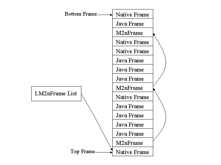 Figure 1 shows the code for object allocation. Columns one and two show the hand-written IA-32 and IPF assembly code, and column three shows the equivalent LIL code, which is described in detail in Section 3. The stub is intended to be called directly from JIT-generated code, and is called with two arguments: the object size in bytes and the vtable pointer that corresponds to the object type. Notice the differences between the first two columns—the different instruction sets and the different calling conventions. The purpose of LIL is to abstract away these differences by generating platform-specific code sequences automatically. In this way, the VM could be ported to a new platform without needing to rewrite and maintain a large body of custom stub code. 2.3 MRE-Specific IssuesAnother difference between columns one and two of Figure 1 concerns MRE-specific details. ORP has a per-thread structure that holds information about each thread, including the frontier and limit pointers for thread-local memory allocation. A pointer to this structure is stored in the thread-local storage provided by the platform's threading system. Thus, a stub can obtain a pointer to the ORP thread structure for the current thread by loading it from the thread-local storage. We call this operation loading the thread pointer. How it is done varies by both architecture and operating system. Row two of Figure 1 shows how it is achieved on Win32 operating systems. On the IA-32 architecture, it is loaded from a fixed offset in the fs segment; on the IPF architecture, ORP keeps the pointer in register r4 (normally a preserved register). On Linux, the pointer is obtained by calling a function provided by the pthreads library.Another MRE-specific issue is M2nFrames . Each time JIT-generated code calls native code, ORP requires that a marker be inserted between the two activation frames on the stack. This marker is necessary because of the way ORP implements stack walking, used in tasks such as root-set enumeration, exception propagation, and stack introspection. We call these markers managed-to-native frames, or M2nFrames . Figure 2 shows the layout of a typical thread's stack. Combining information stored in the M2nFrames with the available information on managed code, the VM can easily locate each managed activation frame on the stack. The details of this scheme are not important to this paper. What is important is that any stub that might cause stack walking, either directly or indirectly, must push an M2nFrame onto the stack upon entry, and pop it before returning. The M2nFrame is actually part of the stub's activation frame. Also important to this paper is that the details of setting up M2nFrames are specific to the implementation of the VM and to the architecture. Therefore, stub code cannot be made portable unless these details are abstracted away.