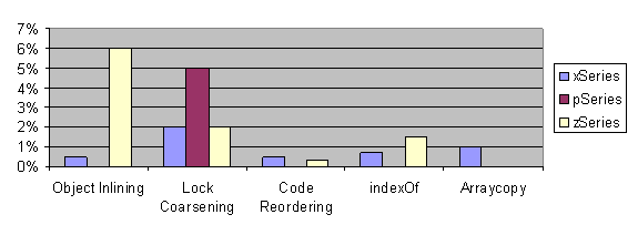 comparable to, the Many of the features we’ve described in Section 3 improve the performance of the SPECjbb2000 benchmark. The benefit for each such feature for three platforms (xSeries®, pSeries®, and zSeries®) and for the IBM Developer Kit for Java product is shown in Figure 1. The percentage improvement is in the self-reporting score relative to the same score without the specific feature. Note that some bars are not present in this graph because those features have not been implemented for that particular platform or for this particular product. The xSeries results were measured on a 4x2.8Ghz Pentium 4 system with Intel Hyper-threading enabled running Microsoft Windows 2000. The pSeries results were measured on a 16-way 1.1Ghz POWER4 p670 system running AIX® 5.1. The zSeries results were measured on a variety of different machine configurations and so these results in particular should not be compared directly against one another.