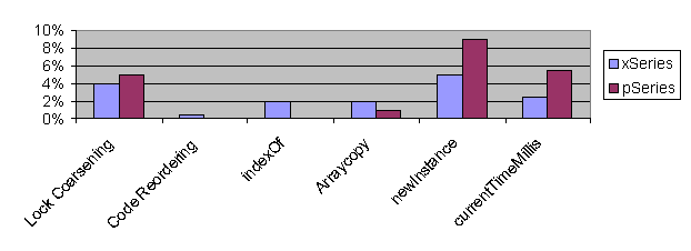 are marked as rare code. In contrast to the first problem, the second problem is significant. The condition test is turned into a forward branch around the code outputting the trace information. Most current processors, by default, assume that forward branches are not taken. To alleviate this problem, current processors also include prediction tables that remember what happened the last time a branch was executed. These tables are used by the processor to predict future outcomes for branches based on the information about earlier branch outcomes stored in the table. Unfortunately, these tables are a scarce resource, and middleware applications can be so large that by the time a branch instruction is fetched a second or subsequent time, the history for that instruction has already been ejected. When there is no historical data in the table for a branch, the processor falls back to the default not-taken prediction for a forward branch. The processor then speculatively executes the tracing code only to discover several cycles later that it had mispredicted the branch and must throw away all the work it has done. Recovering from a branch misprediction can take more than 10 processor cycles, depending on the processor, plus any work it has done since the prediction was made must also be discarded. The third problem results in instruction cache and, potentially, TLB misses because the code executing is typically spread over more cache lines or memory pages than is necessary. To solve these three problems, the JIT reorders the basic blocks of each method to make each block's most commonly executed successor its fall-through successor. Since the JIT has information about which direction each branch favors, branches with a relatively biased outcome such as debugging tests can be flipped so that the processor's default not-taken prediction for forward branches becomes the correct prediction. Some processors do not even try to remember a branch if its prediction matches the default prediction, which means this optimization can have a secondary performance benefit because more branches can be maintained in the prediction tables than before. Finally, because the commonly executed code appears close together in memory, fewer instruction cache and TLB misses are expected. Although reordering code along hot paths is not a new idea [13], we have found it to be particularly effective in the context of a JIT compiler. 5. ResultsIn this section, we report the benefits we have seen in a group of benchmarks relevant to server and middleware application performance. The improvements we report have not been collected at a single point in time but rather over the course of the recent product development cycle for the practical reason that it is not always possible or reasonable to maintain code to selectively enable or disable particular features. In a production JIT compiler, wherever serviceability is not improved by such code, it is eliminated after a testing cycle to simplify code maintenance. The impact of this practise on the results of this section is that individual improvements should not be considered additive. If two improvements are measured at 3% and 5%, one should not conclude that the two improvements together would provide an aggregate 8% speedup; the two measurements have implicitly different baselines. Furthermore, IBM maintains more than one Java JIT product and some improvements are specific to one particular technology base. The two products we have evaluated are the IBM Developer Kit for Java and the J9 Java virtual machine. Moreover, some of the improvements described in this section are platform-specific. These results should not be carried across to other platforms as the improvements will vary considerably from platform to platform; the work done for one platform may be irrelevant or even harmful for another. To the best of our knowledge, we have not excluded any result available to us simply because it degraded performance. In all cases, we have made an effort to collect together improvements that can reasonably be considered together by platform or by underlying JIT technology, though these improvements should never be interpreted in any additive sense except where explicitly noted. The results in this section are organized by benchmark. The improvements that had an impact on each benchmark are listed in each subsection. The benchmarks we discuss are: SPECjbb2000[16], SPECjAppServer2002[15], XML Parser[14], a cryptography-based micro-benchmark, and IBM WebSphere® Application Server start-up. 5.1. SPECjbb2000The SPECjbb2000 benchmark models a pure