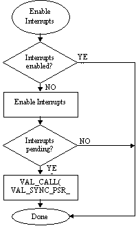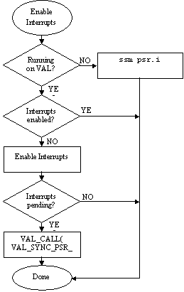 Figure 2 – Enabling Interrupts with Paravirtualization 4.3 BatchingIn many cases, replacing emulation of a single privileged operation with a single VAL service call provides negligible savings. However, if a group of privileged operations can be replaced by a single VAL service call, significant performance improvements can result. For example, when a guest is performing a task switch it will usually update several (or all) of the region registers with address space values appropriate for the new task. Rather than making a VAL call for each individual region register, one VAL service allows all eight to be updated with a single call. 4.4 Transparent ParavirtualizationThe performance advantages of paravirtualization are evident. As previously noted, there are disadvantages to requiring a separate binary for running native vs. running as a guest on a virtual machine. If an operating system can determine whether or not it is running virtualized, it can make optimal execution choices at runtime and the same binary can be used. We call this transparent paravirtualization.