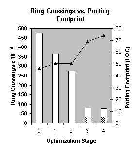 Figure 3 – Enabling Interrupts using Transparent Paravirtualization VBlades utilizes a reserved bit in a privileged configuration register to let the operating system know whether or not it is running virtualized. According to the Itanium architecture definition, reserved bits in the configuration register are always set to zero. When the vBlades hypervisor executes the privileged instruction that returns this register, it sets one of the reserved bits to one. Thus, an operating system can execute this instruction early in the startup process and conditionally set a global variable to record whether or not it is running as a vBlades guest. Once this variable is set, subsequent transparent code can test the variable and react accordingly as illustrated in Figure 3. In a transparently paravirtualized operating system, this conditional test may occur with relatively high frequency; indeed, every piece of paravirtualized code requires the test. When running as a guest, the incremental cost of the additional test is small relative to virtualization overhead. We conjectured that the cost when running native would also be small. First, in a fully paravirtualized guest, the number of tests is at most one per privileged instruction. Second, the frequency of privileged instructions in all but the most system-centric micro-benchmarks is at least two to three orders of magnitude lower than unprivileged instructions. Third, a well-defined paravirtualization interface eliminates many privileged instructions. Finally, high frequency access to the conditional test variable ensures its presence in cache memory, guaranteeing a low cycle count for the conditional test. To test our conjecture, we ran a simple but non-trivial benchmark: Linux compiling itself. The difference was indeed negligible, with the magnitude dwarfed by the natural variability in the benchmark results; we expect a more comprehensive set of benchmarks to show that degradation is less than 0.1%. If true, this would show that the performance impact of transparent virtualization on a native operating system is, as its name would imply, transparent. 4.5 Optimized ParavirtualizationOne of our design principles requires limiting changes to the guest, yet we wish to minimize the performance degradation of the paravirtualized guest. This is clearly an iterative and subjective process: Some guests may have stringent requirements on code change, while others may be much more focused on performance. We refer to the process as optimized paravirtualization. To measure the degree of change to the guest, we define the set of changes necessary to implement paravirtualization as the porting footprint. Changes to the guest fall into two categories: invasive changes and supporting changes. Invasive changes are those that affect one or more existing source or build files. Supporting changes are newly added source or build files that provide VAL support code necessary for interfacing to the vBlades VAL but do not affect existing code; these are generally linked in as a library. We believe that invasive changes have, by far, the most significant impact on operating system maintenance. Consequently we restrict our definition of porting footprint to include only invasive changes. To support data-driven performance decisions, vBlades is highly instrumented. It records and tabulates all VAL calls, privileged operations, exception deliveries, etc. This level of detail is not only crucial for porting but can also provide an interesting perspective on the operation of the original pre-ported guest. The vast majority of application and guest instructions executed in any benchmark are unprivileged, execute at full speed and are thus irrelevant to a comparison. Since the guest is executing unprivileged, all privileged instructions must either be emulated by the vBlades hypervisor or replaced and paravirtualized through VAL calls. We will refer to these collectively as ring crossings.[2] Obviously, each ring crossing is slower than the native privileged instruction it replaces – perhaps by two to three orders of magnitude. Consequently, reducing the total number of ring crossings improves performance. Further, a VAL call is somewhat less costly than hypervisor emulation since the hypervisor must fetch and decode the privileged instruction. Thus, replacing an emulated privileged instruction with an equivalent VAL call also improves performance. With this in mind, we present ring-crossing results from the previously introduced benchmark (Linux compiling itself) at different stages of optimized paravirtualization of Linux 2.4.20. Prior to the execution of the benchmark, all vBlades counters are zeroed; thus privileged instructions and VAL calls necessary to initialize the system are ignored. The ring crossing results of the different stages are graphically represented in Figure 4. On the second y-axis we show the cumulative porting footprint measured in lines of code. In stage 0, only a minimal set of changes is introduced into Linux to allow it to run as a vBlades guest. There are approximately 474 million ring crossings, all of them due to privileged instructions. These changes have a porting footprint of 46 lines. In stage 1, we replace Linux interrupt enable/disable code with the VAL call mechanism described in Section 4.2. Because of the highly organized nature of the Linux source code, the vast majority of code that enables or disables interrupts uses preprocessor macros defined in a single include file; these macros utilize the Itanium rsm and ssm instructions. We redefine these macros using a patch that has a porting footprint of only four lines. With this minor change, almost 111 million (23%) of the privileged operations are eliminated and replaced with less than one million VAL calls, reducing ring crossings to 363 million. In stage 2, we introduce a vBlades-specific Interruption Vector Table (IVT). In Itanium, the IVT is the entry point for all interrupti